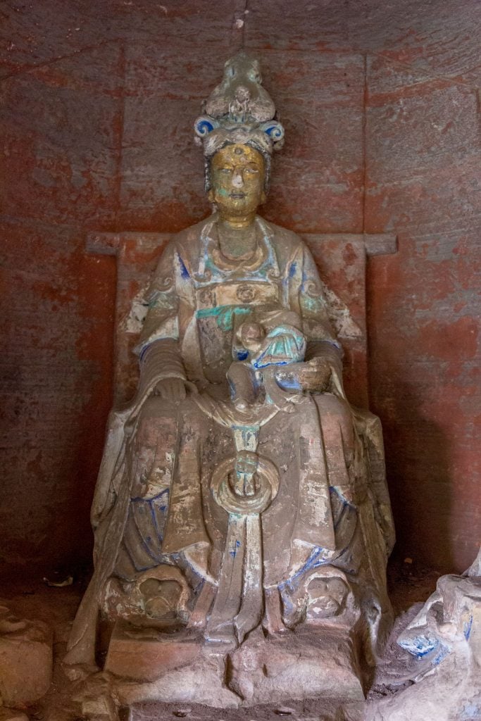 It’s a 20-minute drive from Baodingshan Rock Carvings to Beishan Rock Carvings. Beishan has several places with carvings but those at Fowan is normally referred to as the Beishan Rock Carvings. Beishan is different and consists of a maze of caves and caverns. There is a south and north section which together are over 300 meters long, have over 5000 statues divided over 290 scenes. Another difference is that there are much more details in many of the larger statues. Color too, but the fine details and craftmanship is what I remember.