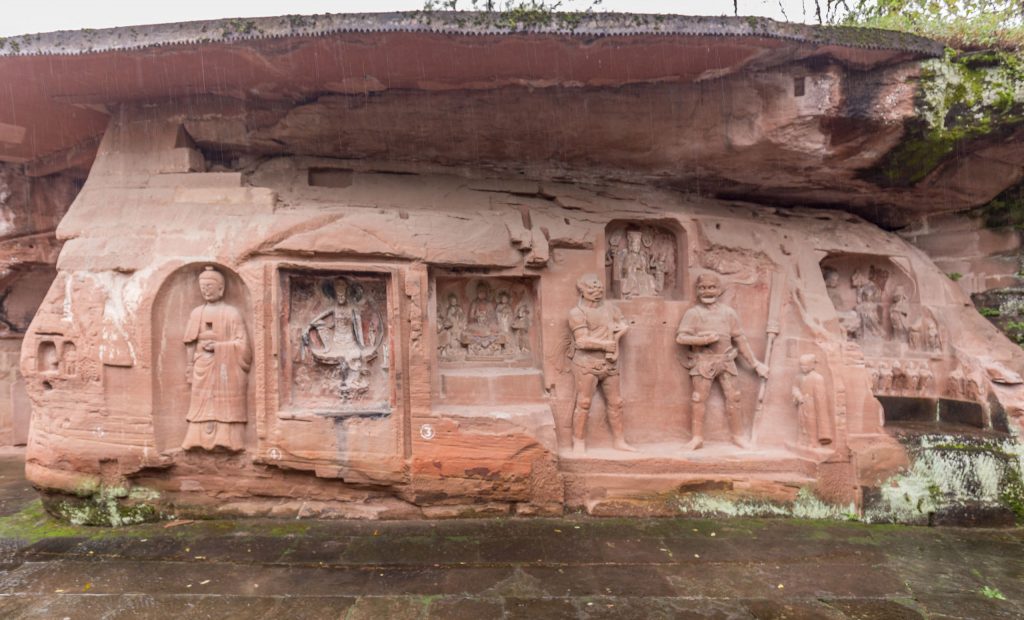 The second part, called Little Buddha Bend, didn’t take that much time. Most interesting where the Buddha Wheel of Life, the Protectors of Buddhist Law, and a few very dark caves. As it started to pour rain I hurried to the nearby museum displaying several artifacts and historical data of the Dazu Rock Carvings. Around lunch time I continued to Beishan.