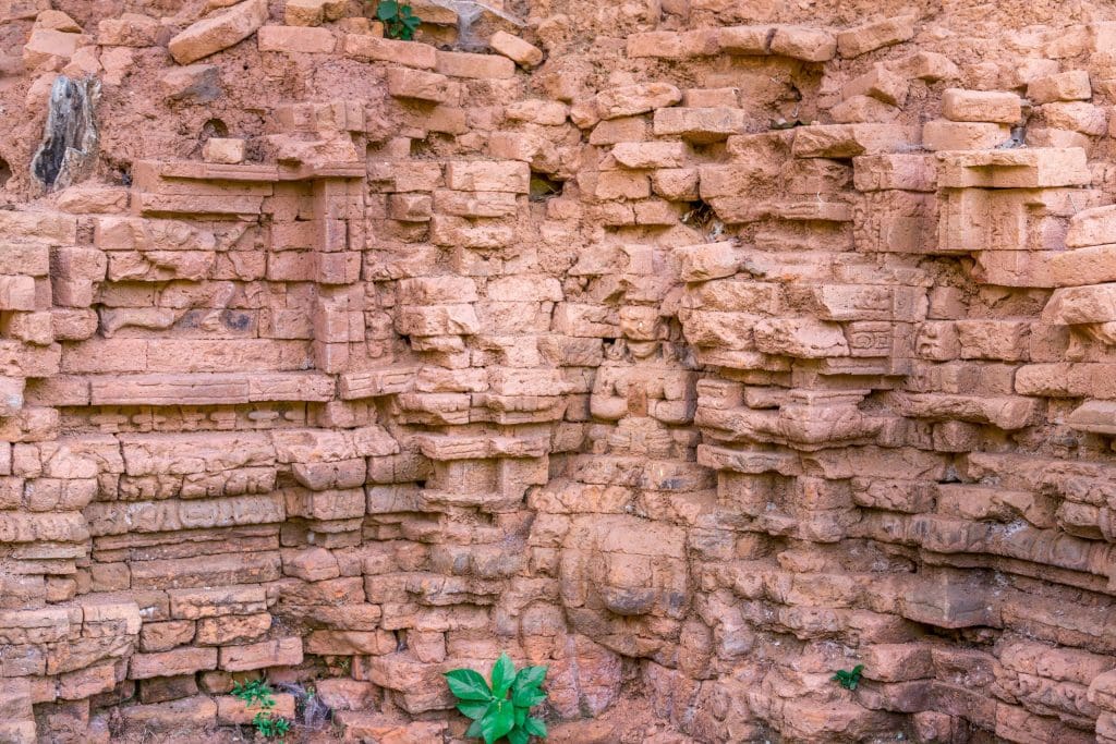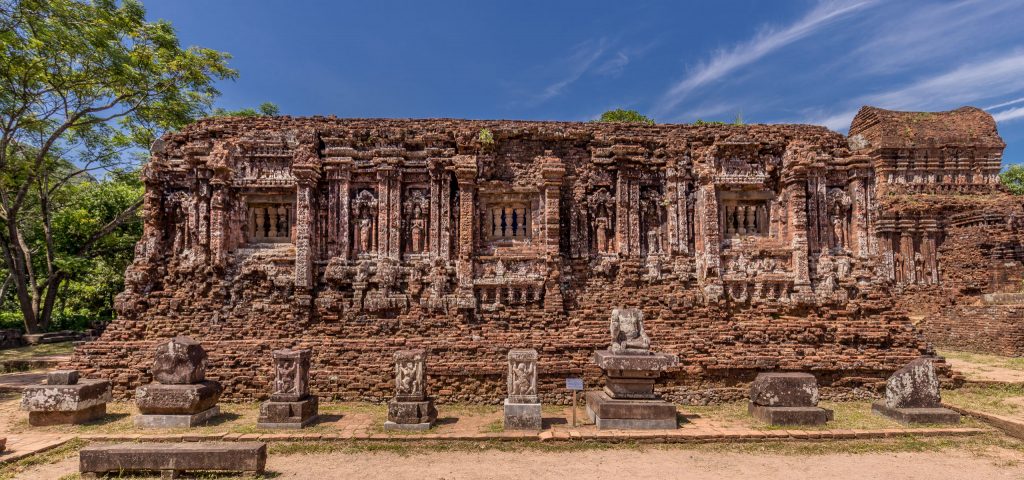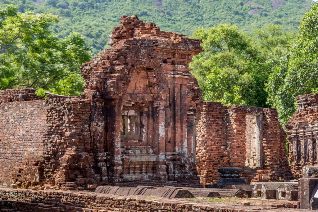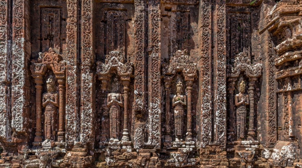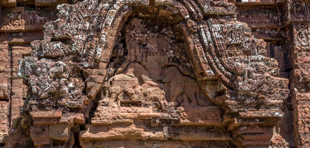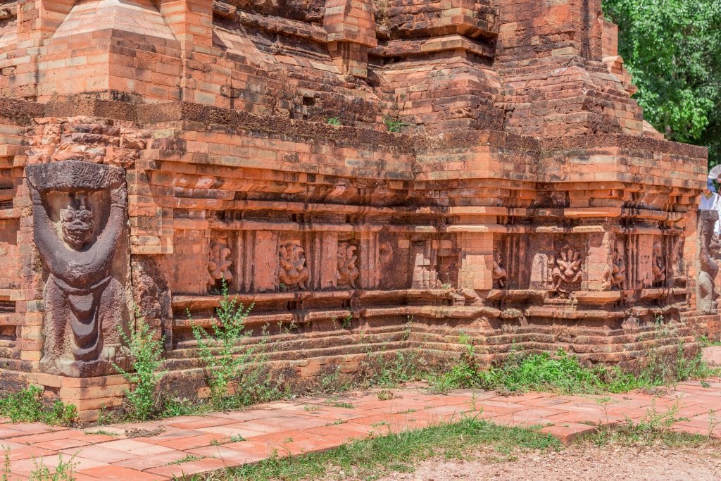 Ever wondered why the temples at the My Son Sanctuary have, or had, so smooth surfaces? That’s because of the way the temples were built. The Champa people used bricks which were not yet fully baked to build the structures and then set the whole thing on fire hardening it as one huge piece. Clever isn’t it? At the My Son Sanctuary you will first enter a complex of temples (if you walk counter-clockwise) which are the best ones preserved. Various buildings in this group of temples have beautiful carved statues on their walls as you can see in the following photo. Most statues however are moved to museums to conserve them better. In my opinion it would be no problem to add some replicas to the site to give a better understanding how the site would have looked liked.