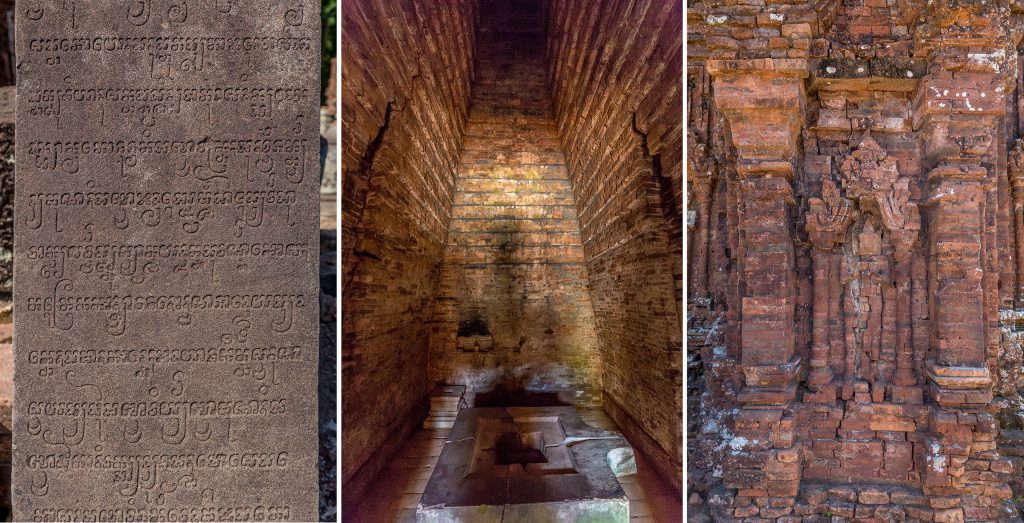My Son Sanctuary got forgotten after the fall of the Champa Kingdoms and overgrown by jungle vegetation. It was at the end of the 19th century that the French rediscovered the complex which was built in a valley surrounded by mountains. They realized that it was an important place comparable with Angkor Wat, Sukhothai and Bagan. The French at that time put a lot of effort in the reconstruction of the temple complex. These reconstructions were however destroyed by the B52 bombings of the Americans in 1969. In a week time all that was conserved got destroyed by these bombings. Most of the complex got destroyed except the part you have seen first. The remainder of the complex is not much more as piles of stones and grass growing over it.