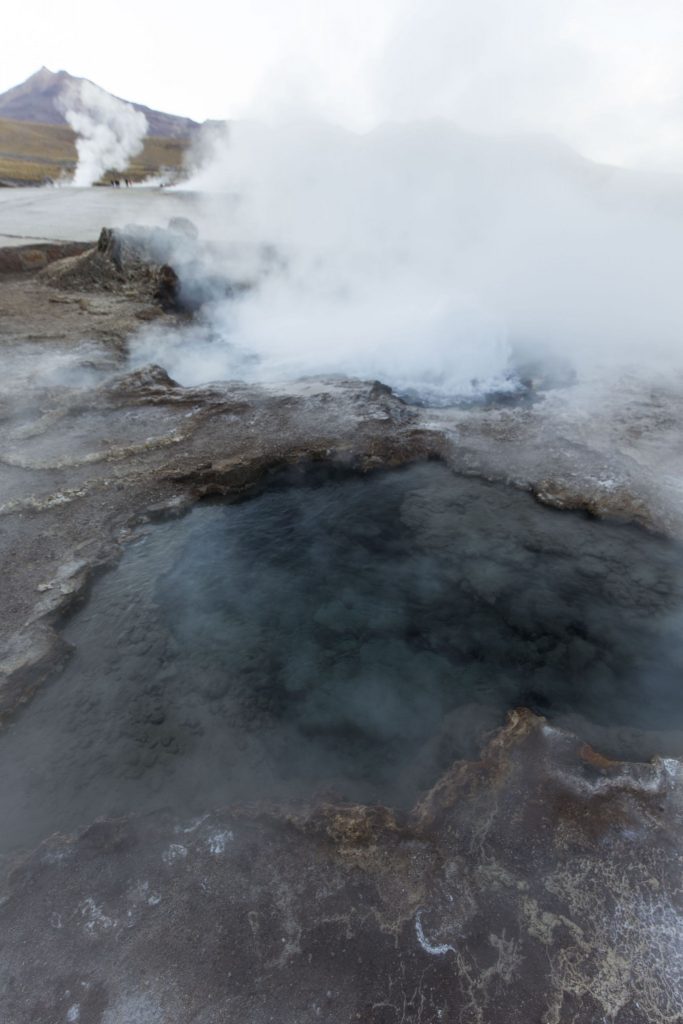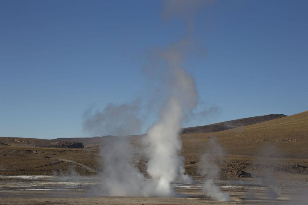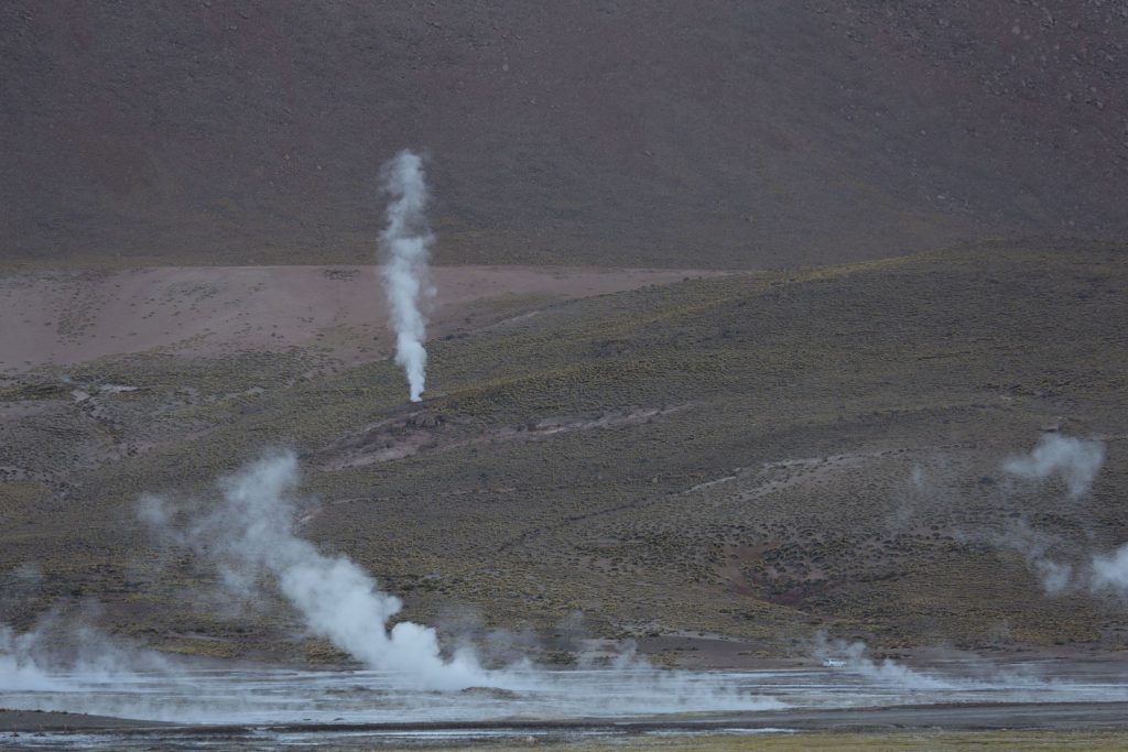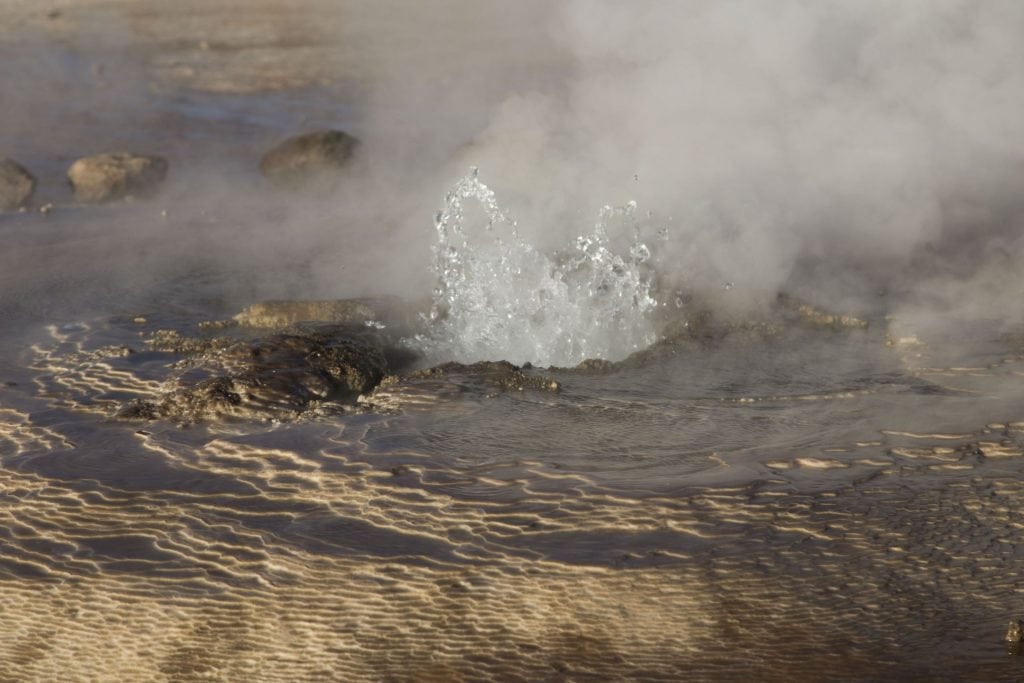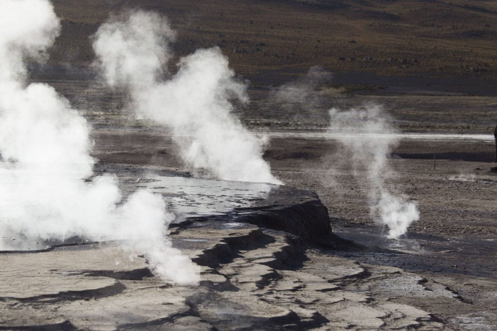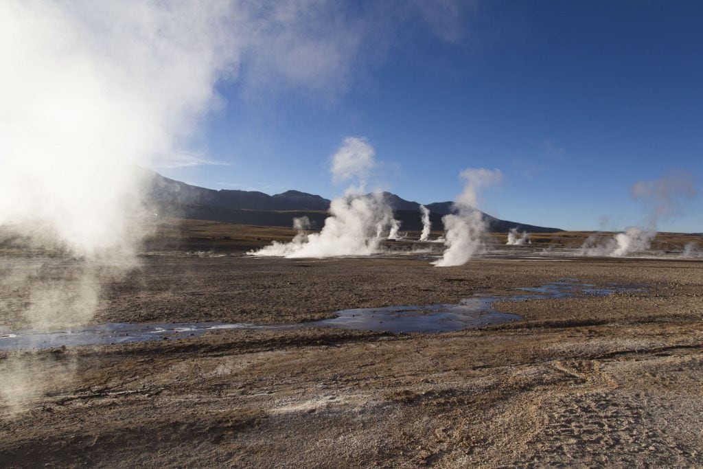 Geysers are a geological phenomenon where water is heated by magma underground and boiled and spit out trough a hole in the earth crust up to a meter high. This steam will condense in the cold air forming the steam columns up to several meters high. At the El Tatio geysers there are over 80 active geysers and the field is the third largest in the world.