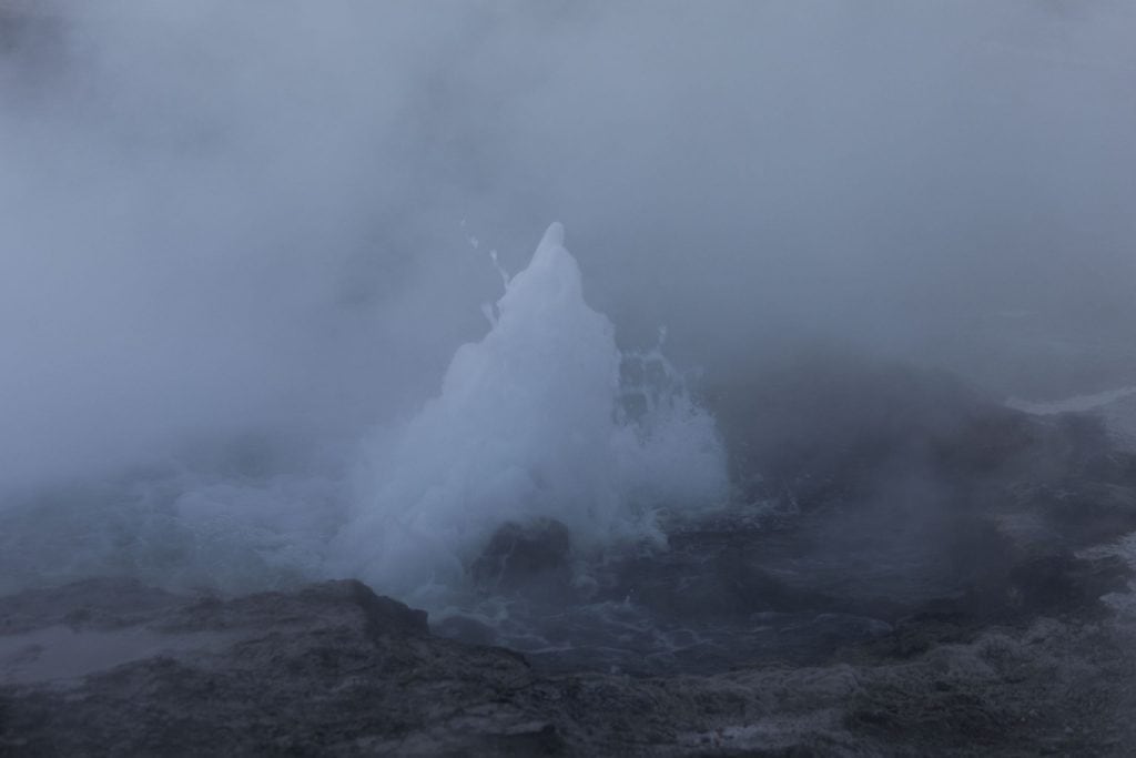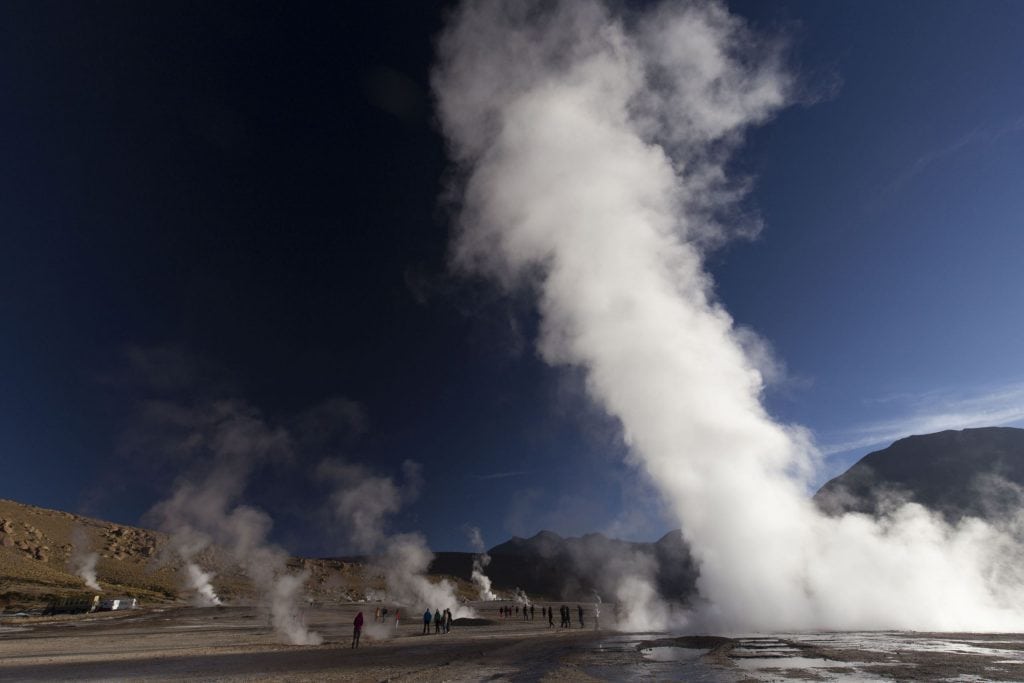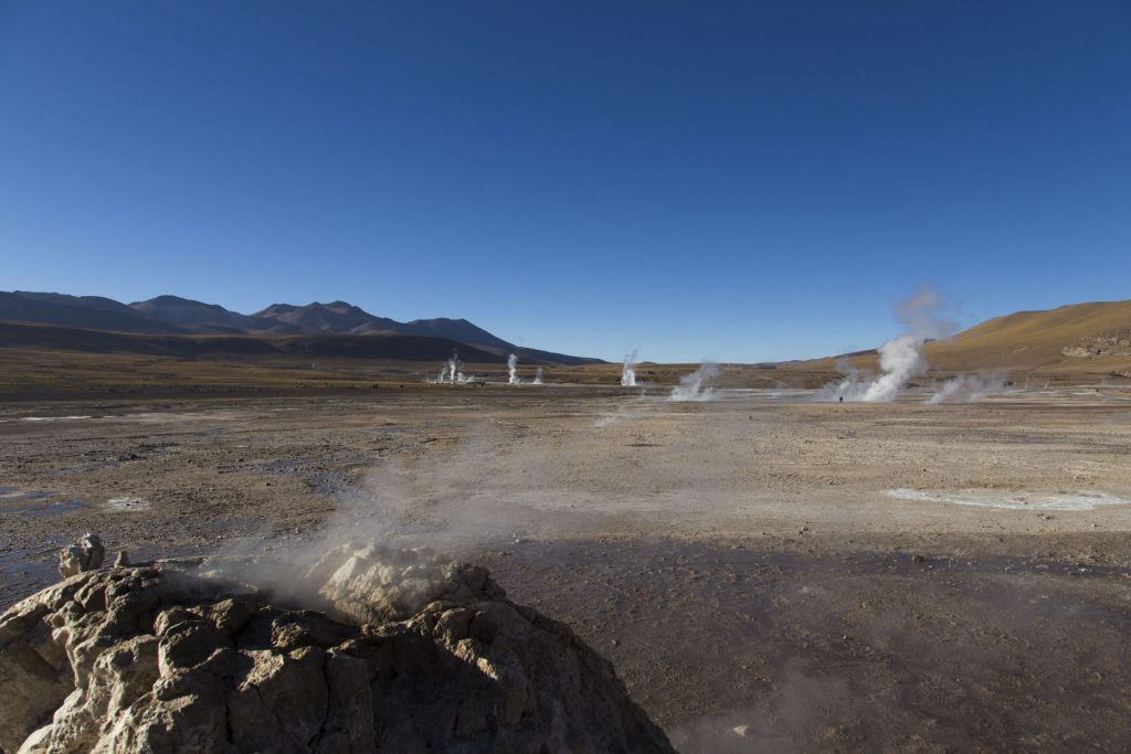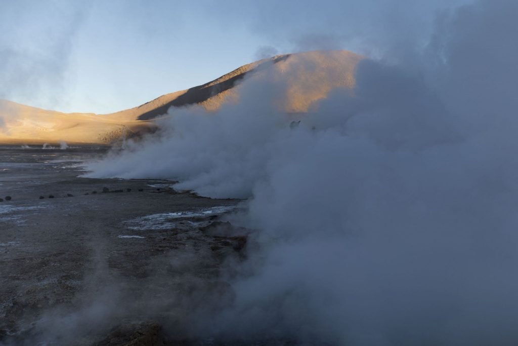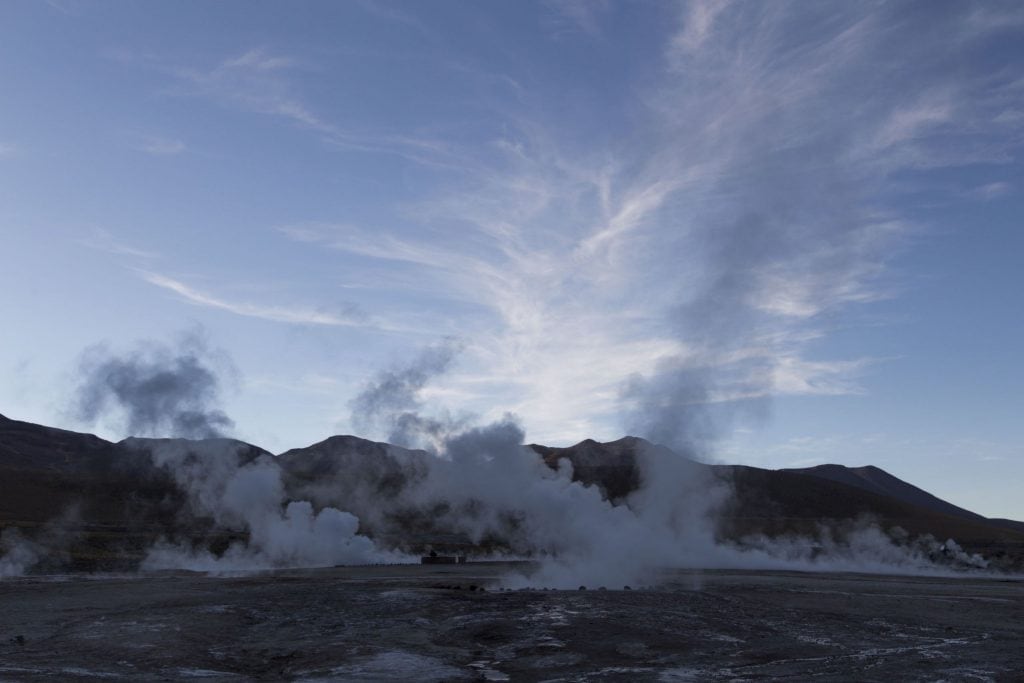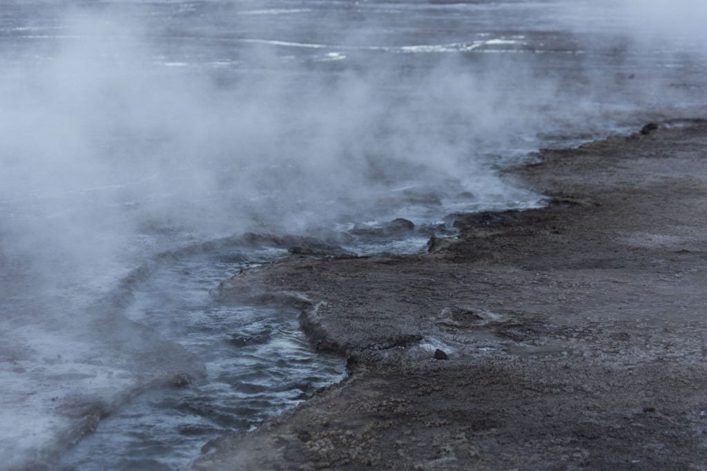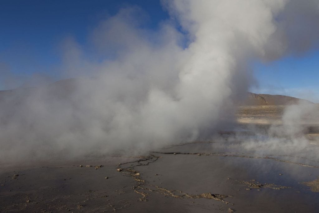 Geysers are a geological phenomenon where water is heated by magma underground and boiled and spit out trough a hole in the earth crust up to a meter high. This steam will condense in the cold air forming the steam columns up to several meters high. At the El Tatio geysers there are over 80 active geysers and the field is the third largest in the world.