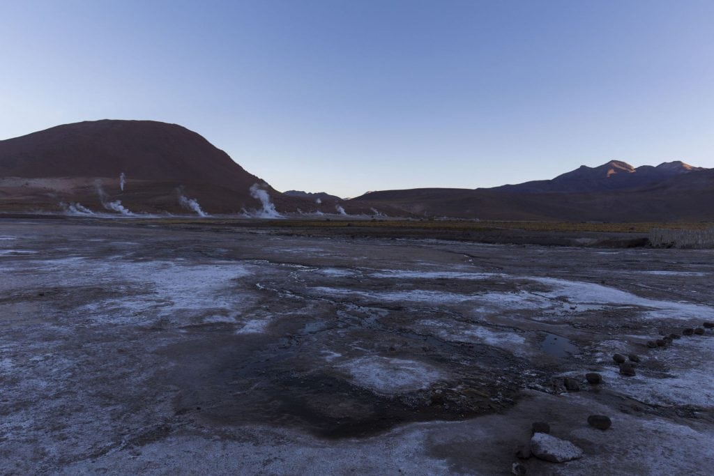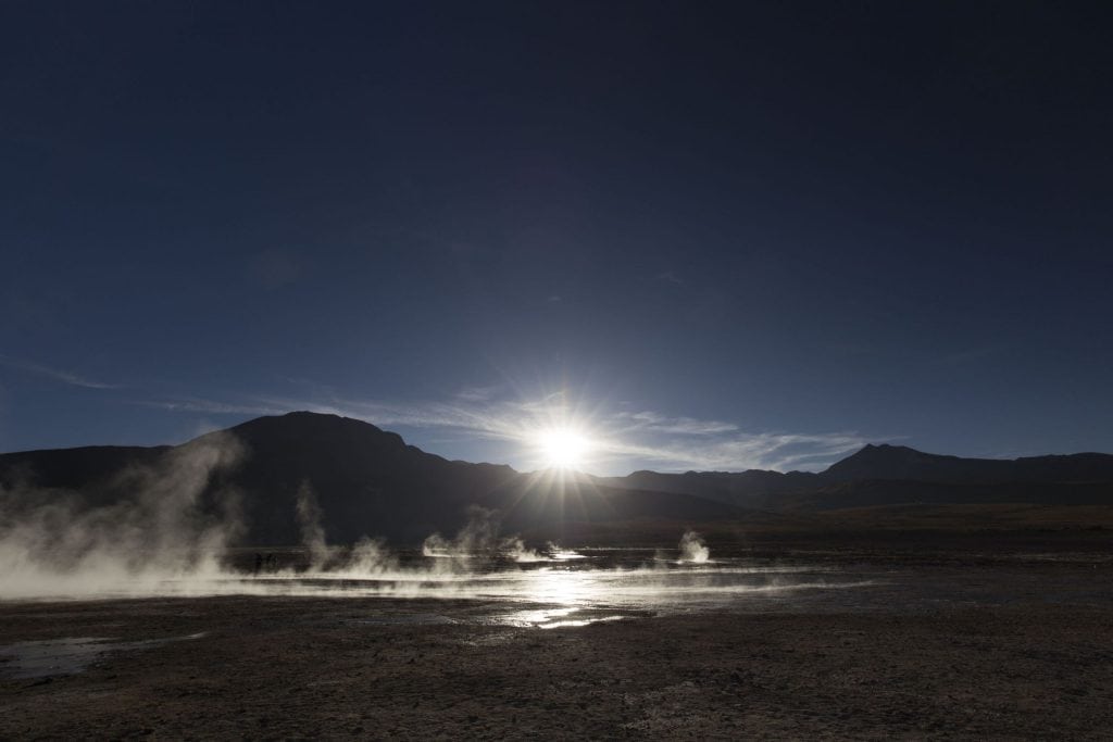 El Tatio geysers are located a 90 minute drive from San Pedro de Atacama in the Andes mountains at an altitude of 4320 meters. The best time to visit the El Tatio geysers is when the sun rises as it will give great light through the water vapour. When the sun heats the air also the steam plumes will disappear. To get there in time the alarm was set at 04:00 AM and departure from the hotel was at 05:00 AM. After a sleepy drive we arrived at the magnificent El Tatio geysers. What is this a great unique sight.