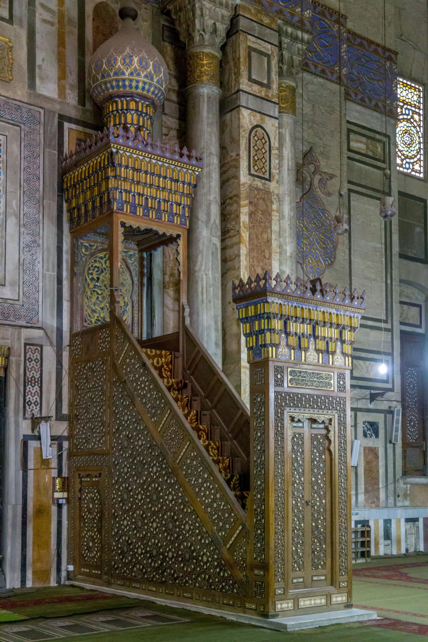 The first entrance leads to the mausoleum of Sultan Qalawun which is a beautiful room decorated with marbles and wood. Fine carvings decorate the walls. The dome has three stained glass windows inspired by European style cathedrals. I have been to several mausoleums and must say this one is for sure one of the most beautiful ones I have seen.
