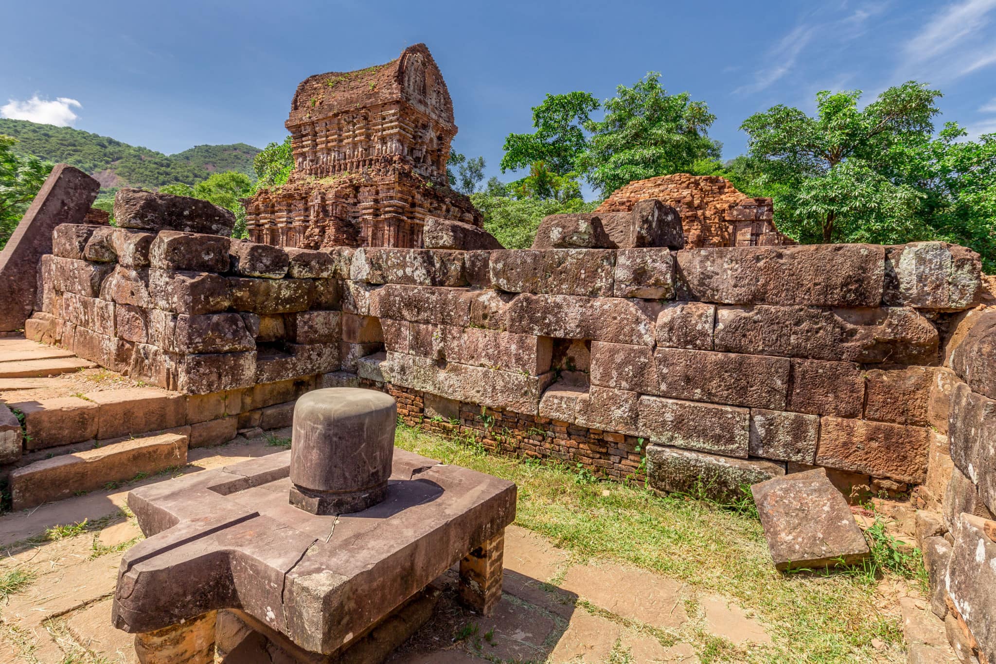 My Son Sanctuary got forgotten after the fall of the Champa Kingdoms and overgrown by jungle vegetation. It was at the end of the 19th century that the French rediscovered the complex which was built in a valley surrounded by mountains. They realized that it was an important place comparable with Angkor Wat, Sukhothai and Bagan. The French at that time put a lot of effort in the reconstruction of the temple complex. These reconstructions were however destroyed by the B52 bombings of the Americans in 1969. In a week time all that was conserved got destroyed by these bombings. Most of the complex got destroyed except the part you have seen first. The remainder of the complex is not much more as piles of stones and grass growing over it.